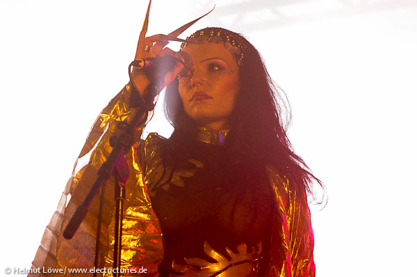 Am zweiten Tag des Amphi-Festivals 2013 traute sich die Sonne noch etwas mehr als am Samstag: Bei strahlend blauem Himmel kletterte das Thermometer noch zwei, drei Grad höher als am eh schon heißen Tag zuvor. Man wunderte sich, wie viele der Musiker aus der Elektroszene, aus den Mittelalter- und Darkrockgenres in ihren zum Teil warmen Bühnenoutfits ihren Auftritt ohne Ausfallerscheinung über die Bühne brachten.