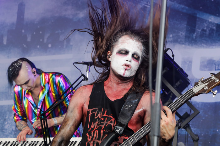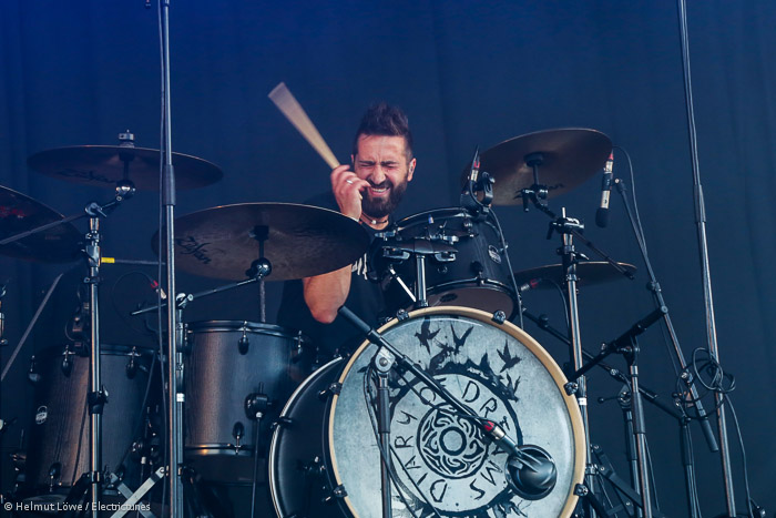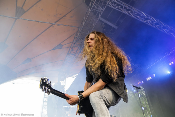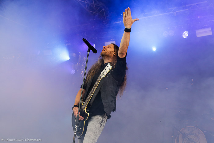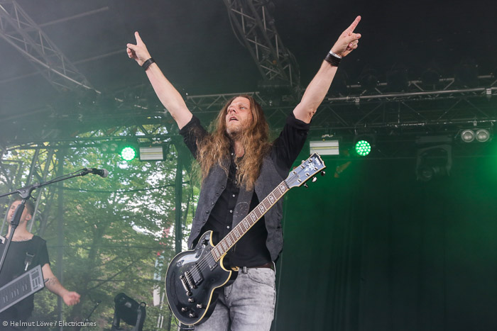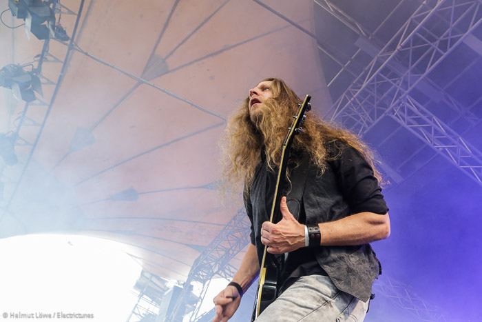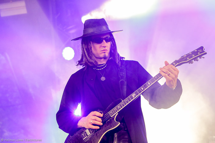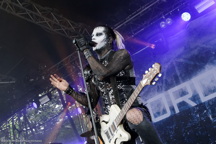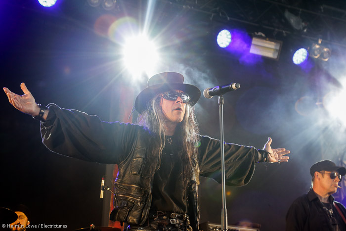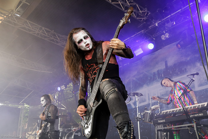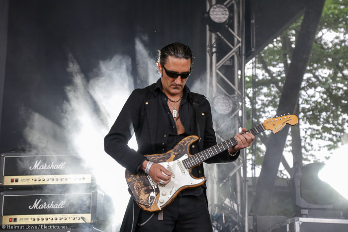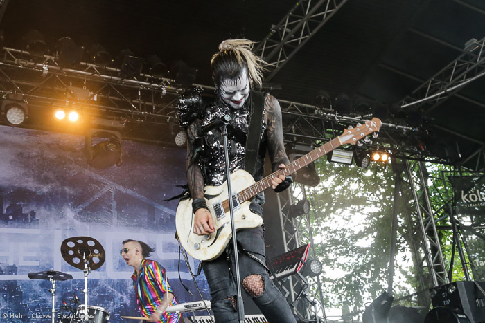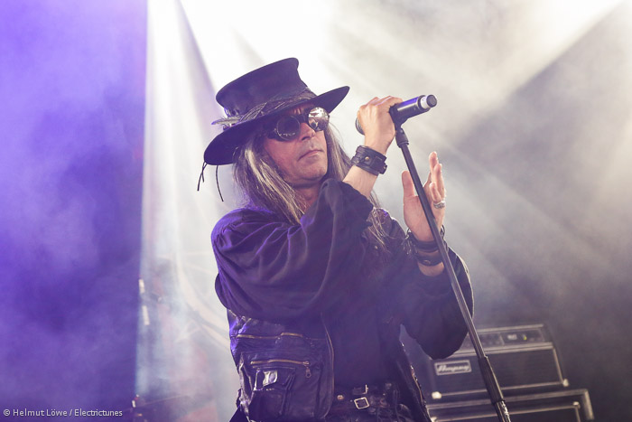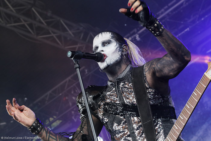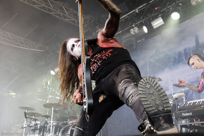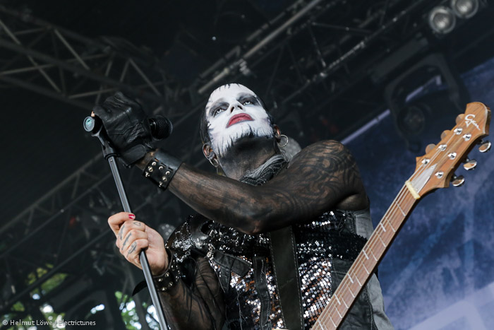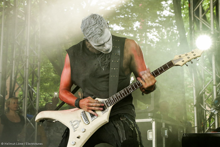 Der erste Tag des Amphi-Festivals 2017 im Kölner Tanzbrunnen gehörte vornehmlich den gitarrenorientierten Bands – wenn man sich das Lineup der Open-Air-Bühne am 22. Juli genauer ansieht: Mit Tanzwut, Lord of the Lost, Diary of Dreams sowie den Gothicrock-Ikonen Fields of the Nephilim gab es reichlich Rock in seinen unterschiedlichen Schattierungen zu hören: ziemlich viel düsteres und mittelalterliches. Und reichlich Körperfarbe obendrein. Tanzwut und Lord of the Lost hatten tief in die Bemalungs- und Gestaltungkiste gegriffen. Der dichte Nebel und die Staubmäntel bei den Fields sind ja fast schon ein altbekannter Hut.